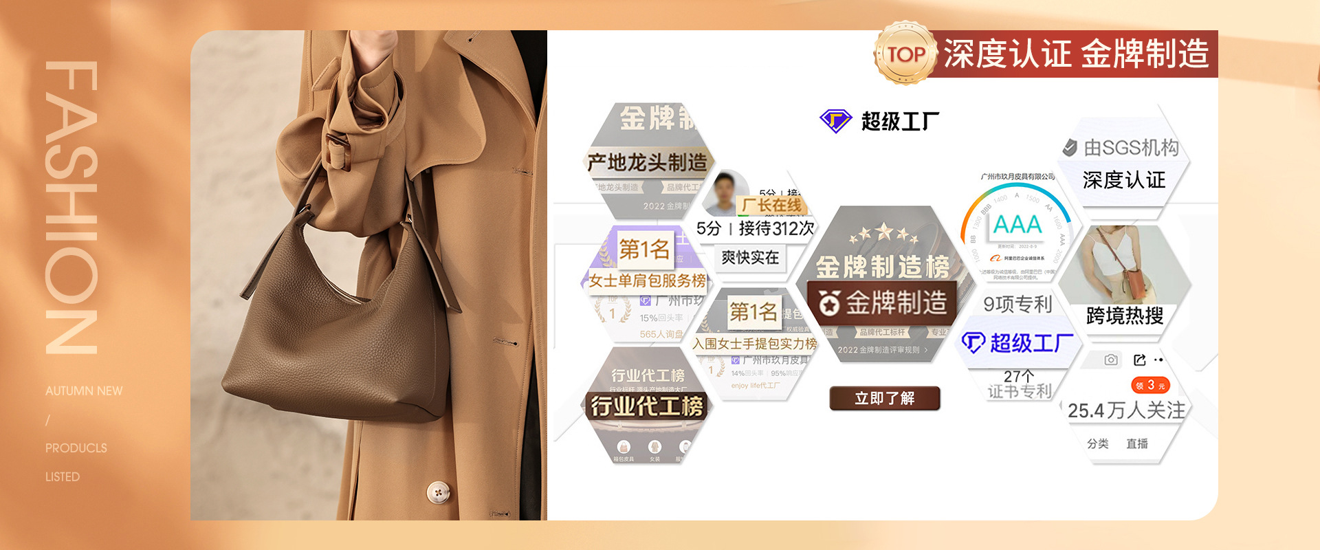 Guangzhou Jiuyue Leather Goods Co., Ltd. Guangdong, Guangzhou, Baiyun District, Junhe Street, Commercial Road, No. 20 | Tier 1 | 8+ | 0.99% | 328.9k | Low ReturnsGood DisputeGood Service | Women's Shoulder BagWomen's HandbagWomen's Crossbody Bag | Quality 3.3 Returns 4.7 Logistics 3.6 Consult 4.5 Dispute 4.0 Overall 5.0 | View contact | |